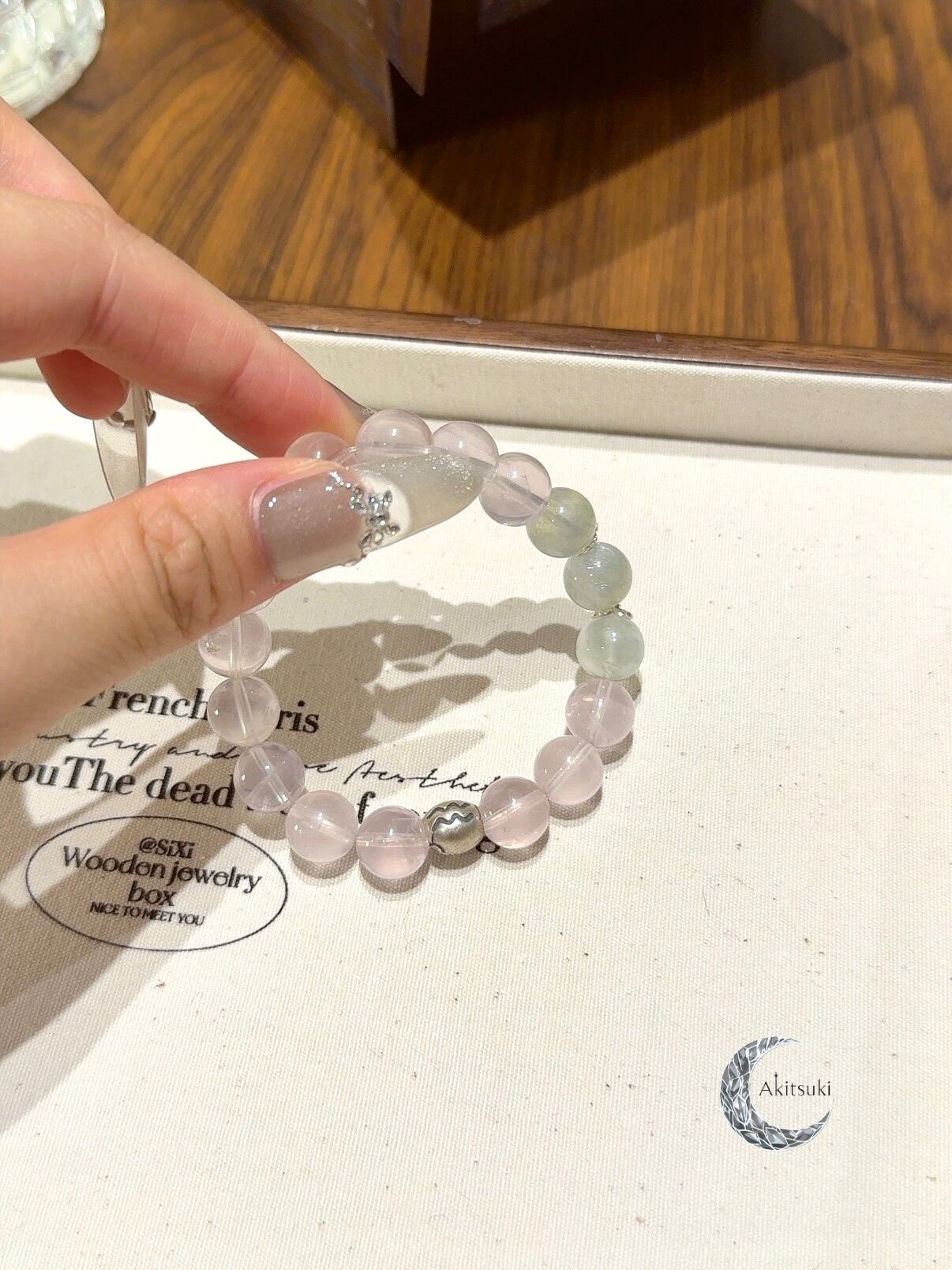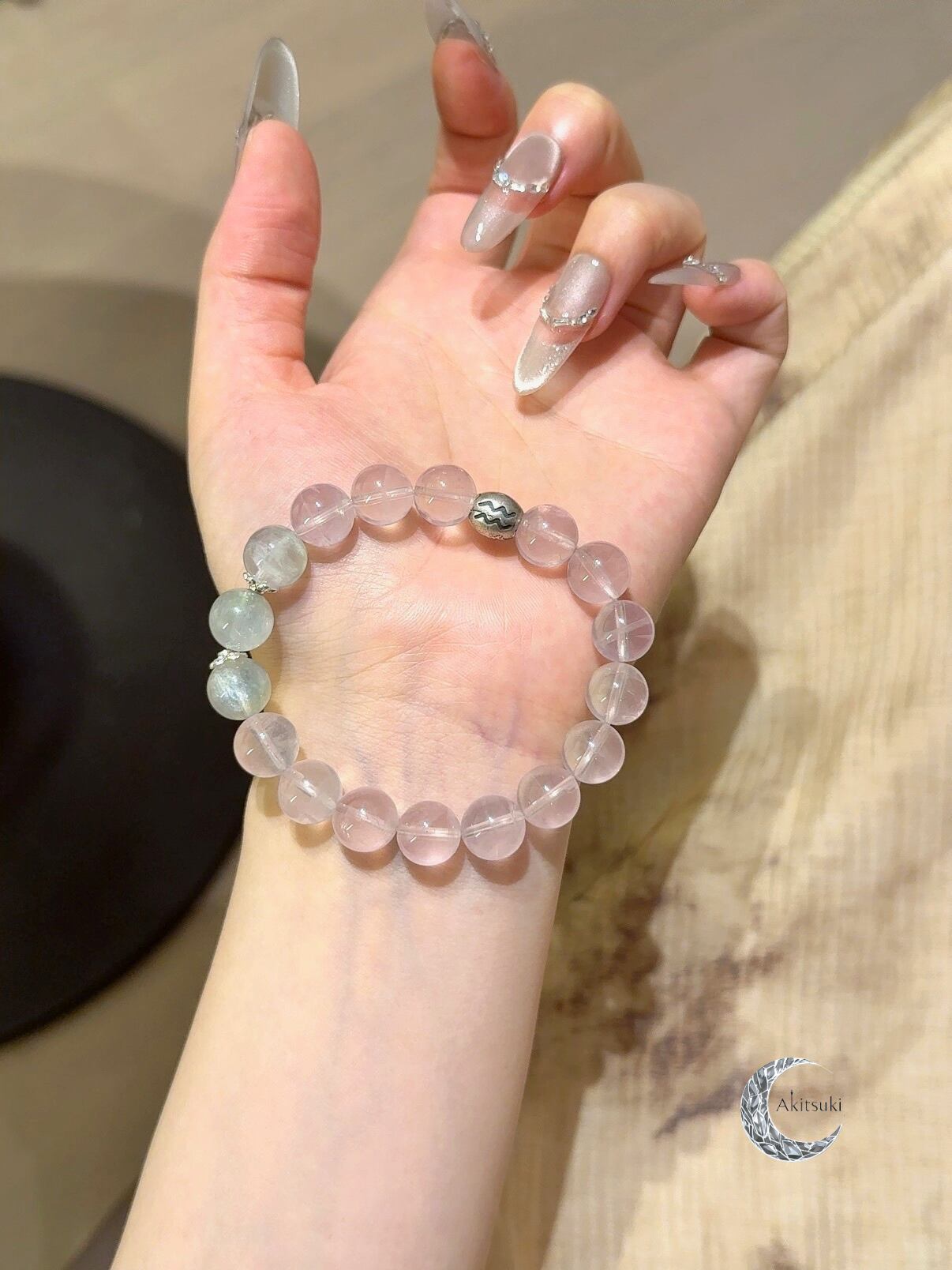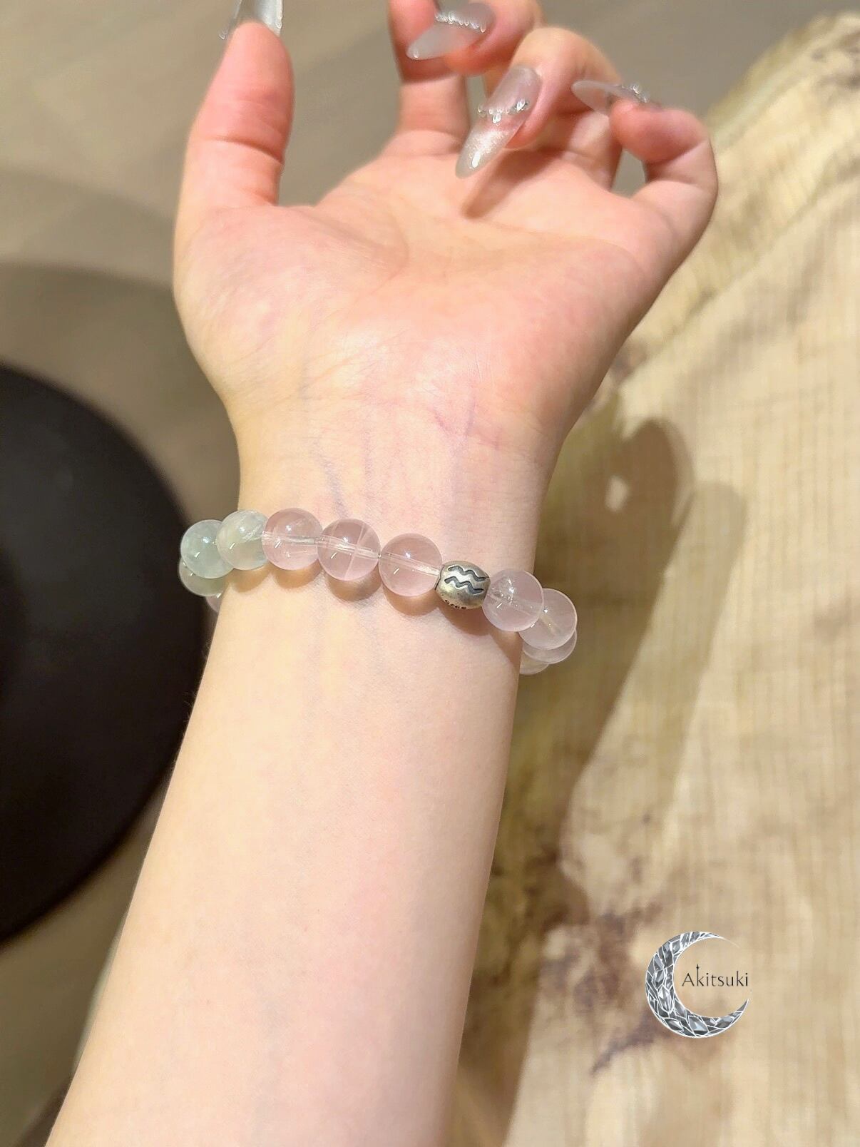 透き通った淡いピンクのメインストーンは柔らかな光を帯び、春風が頬を撫でるように軽やかな雰囲気を醸し出します。プレナイトのアクセントがピンクから優しい緑へとグラデーションを描き、みずがめ座の思考が「感情」から「論理」へと流れるように滑らかで調和した様子を表現。自由な魂を持つみずがめ座そのままの、定義に縛られない姿です。