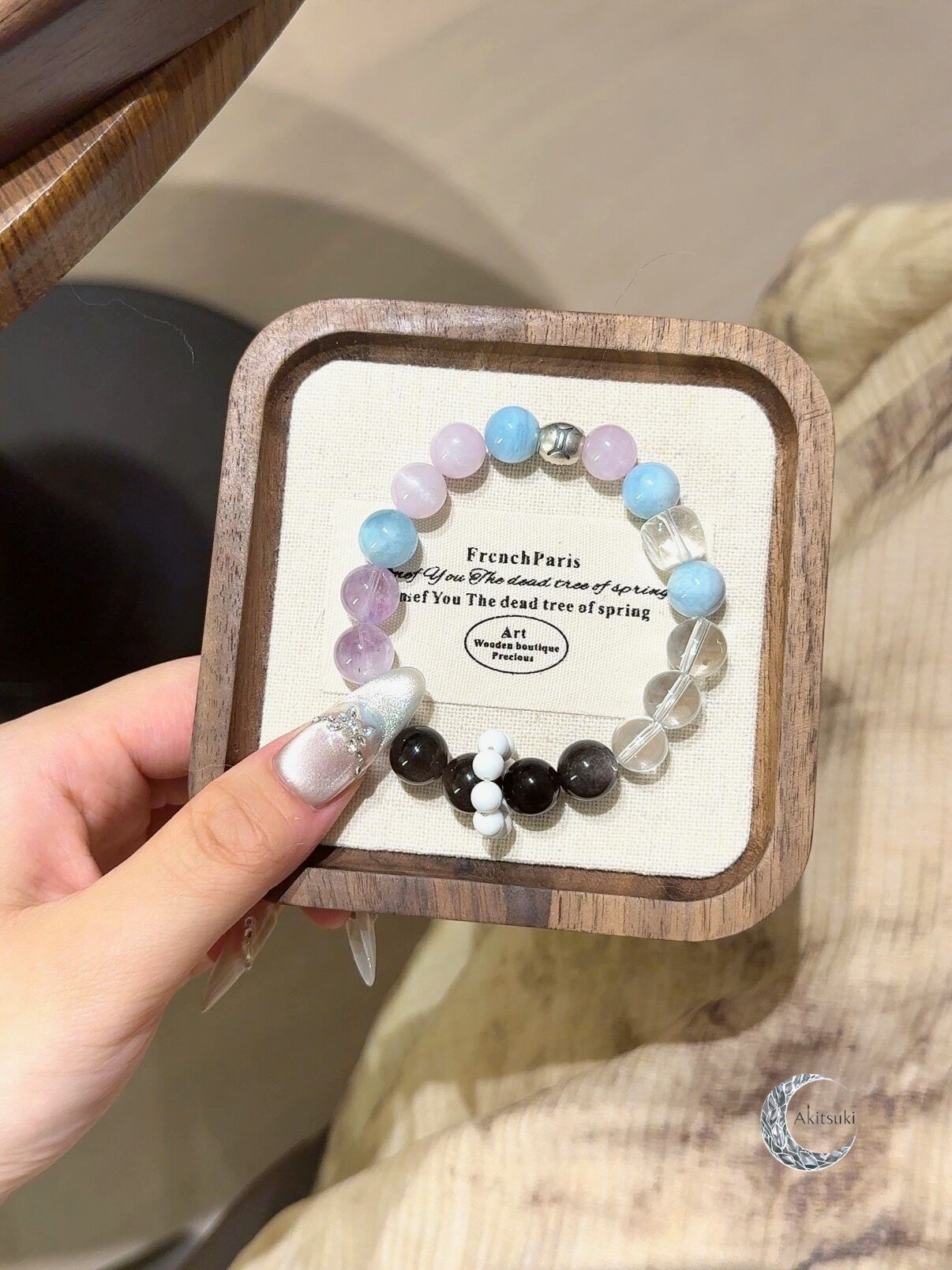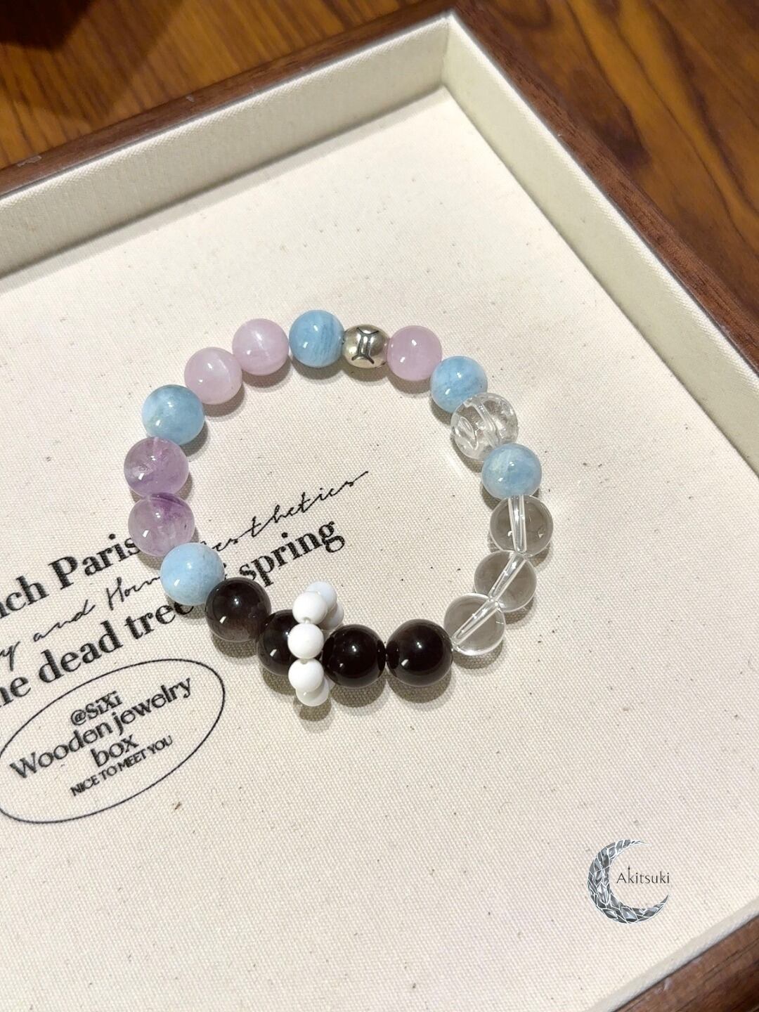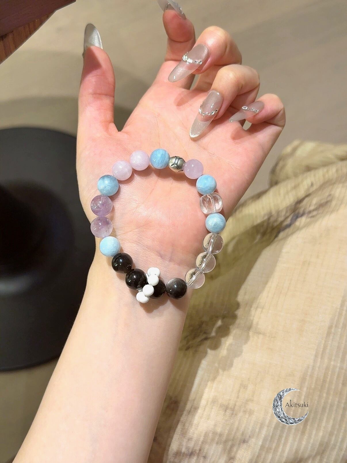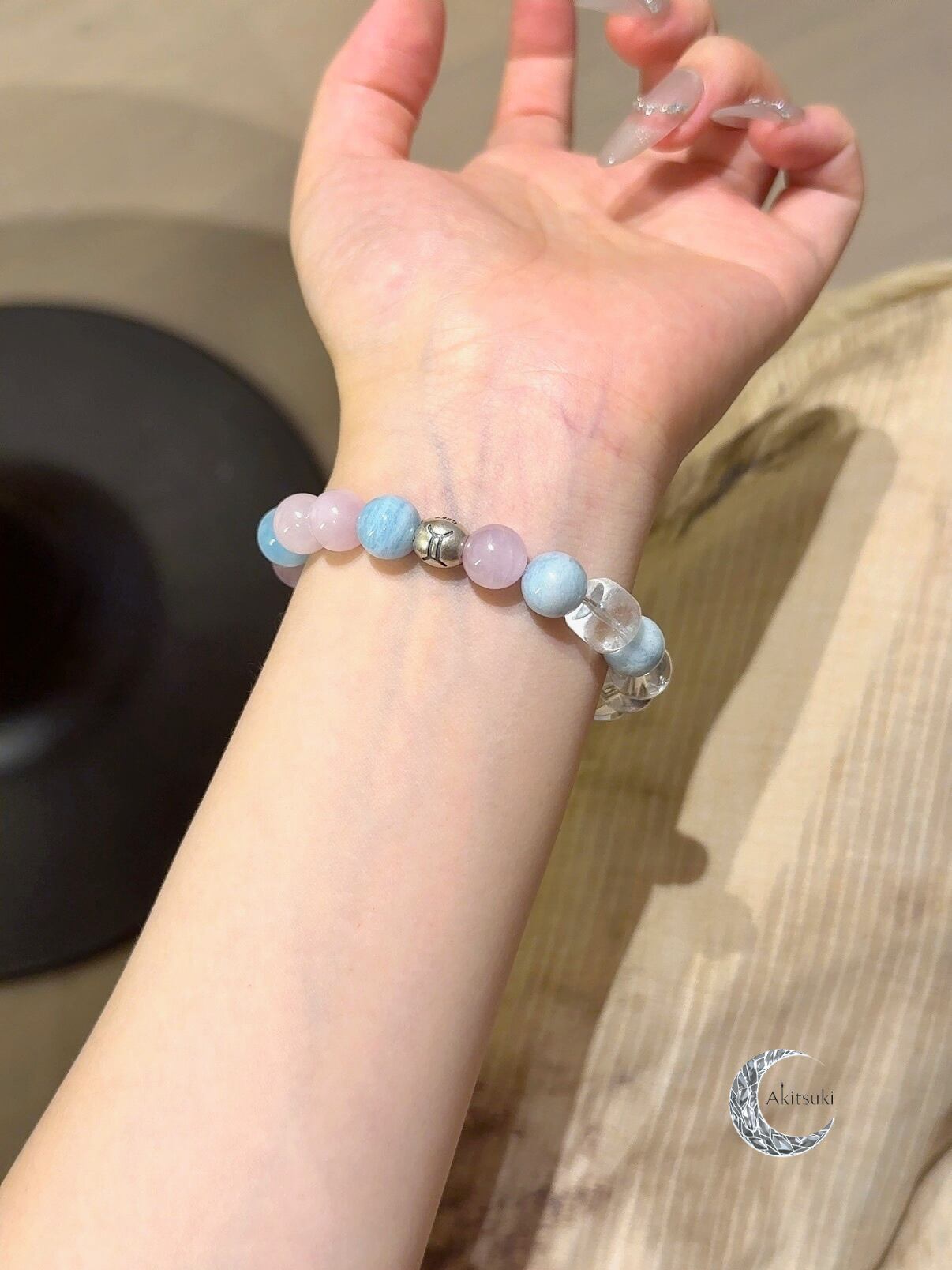 リシア輝石とアクアマリンを交互に配列し、温かく柔らかなリズム感を演出しています。さらに、しっかりと透き通ったホワイトクリスタルとサイコロ型カットビーズが加わることで、全体に清らかな構造感が生まれ、まるでふたご座の「二面思考」が巧みに支えられているかのようです。