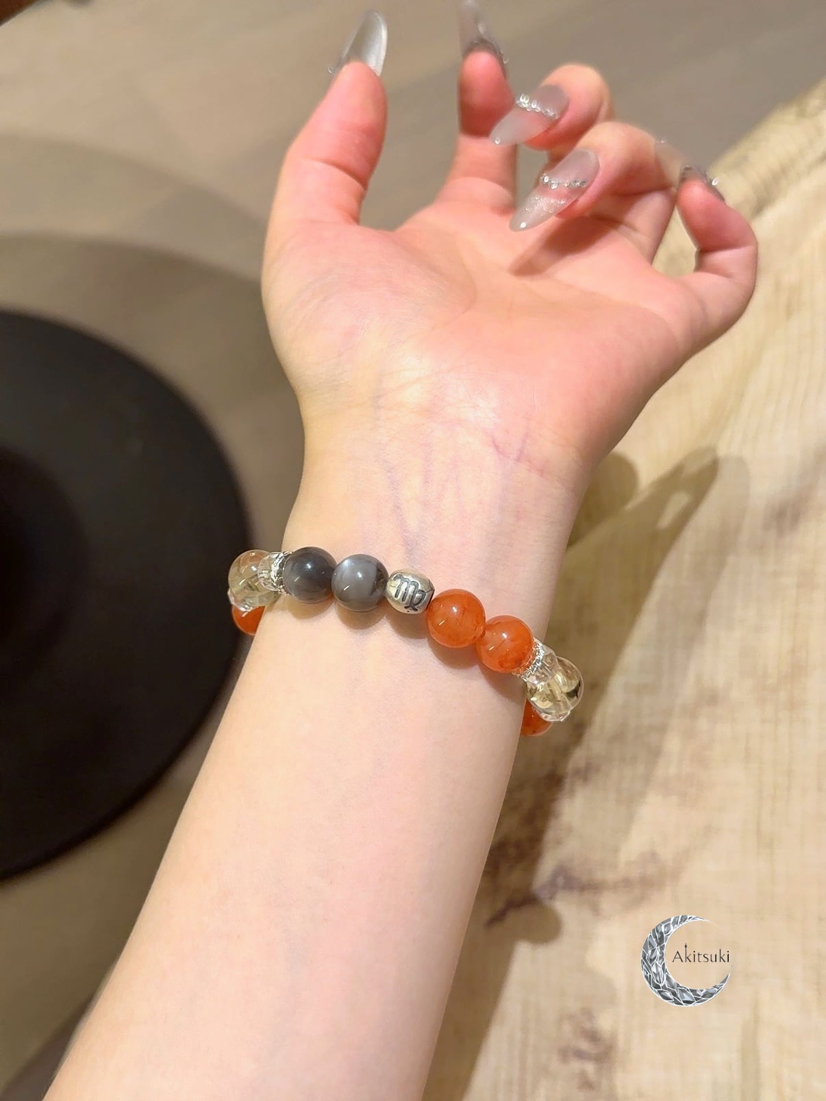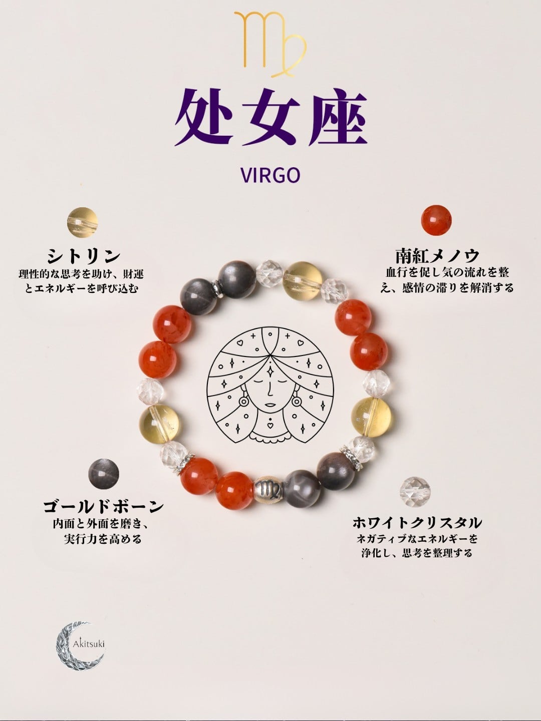 赤・金・白の組み合わせは、力強さとやわらかさがちょうど良く調和しています。ホワイトクリスタルは乙女座の脳の「掃除屋」のように働き、南紅メノウは理性の中に優しさを添えます。一方、ゴールドボーンとシトリンの加わることで、感情の安定とともに「行動力アップ」の効果もプラスされ、効率を落とさずに前進できます。