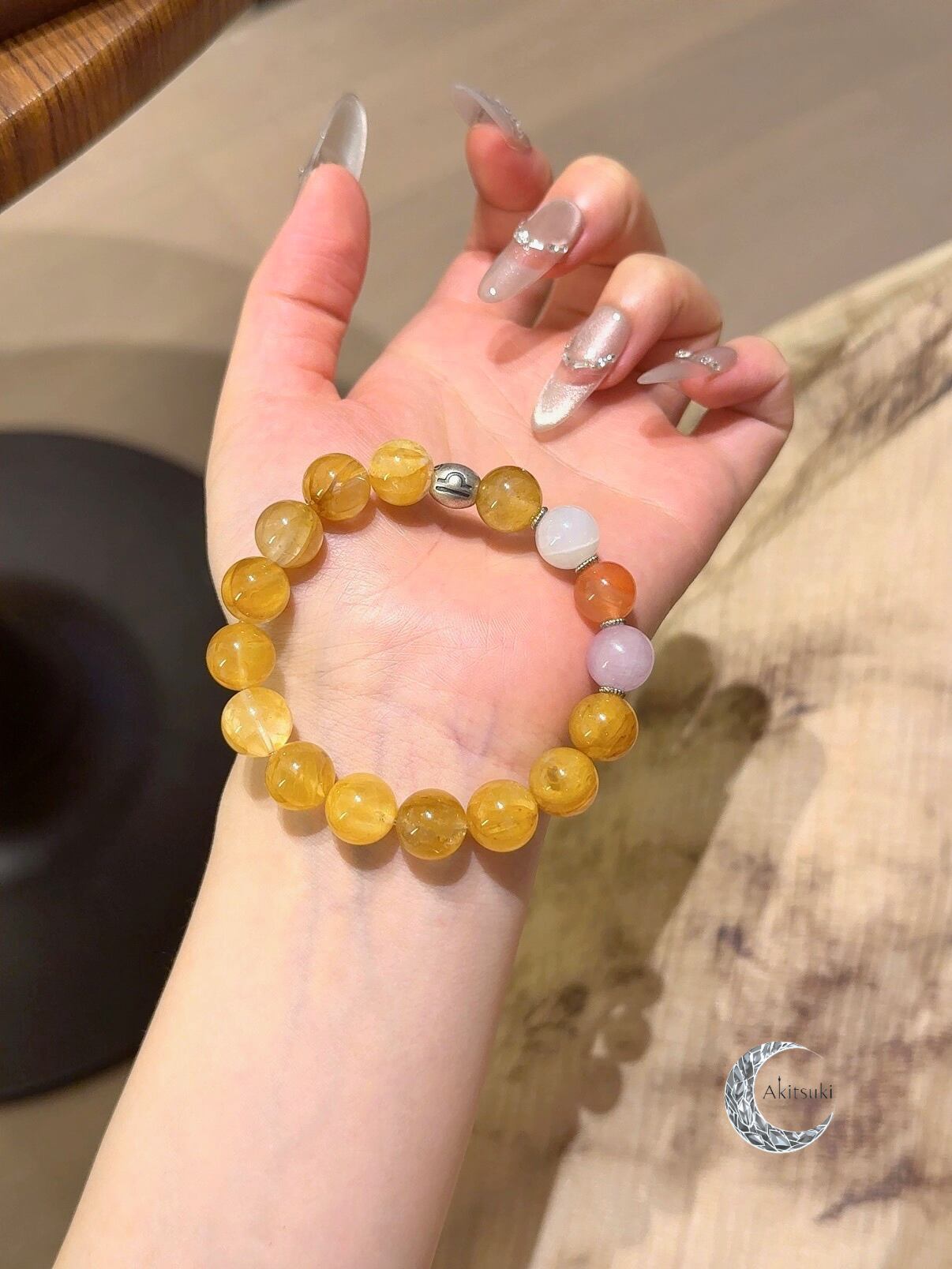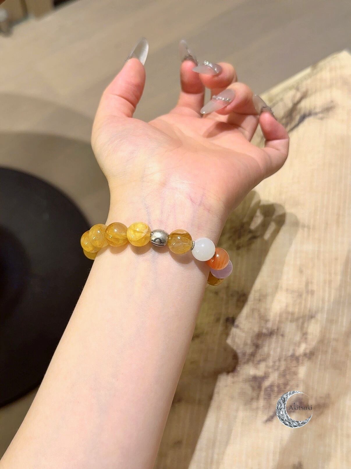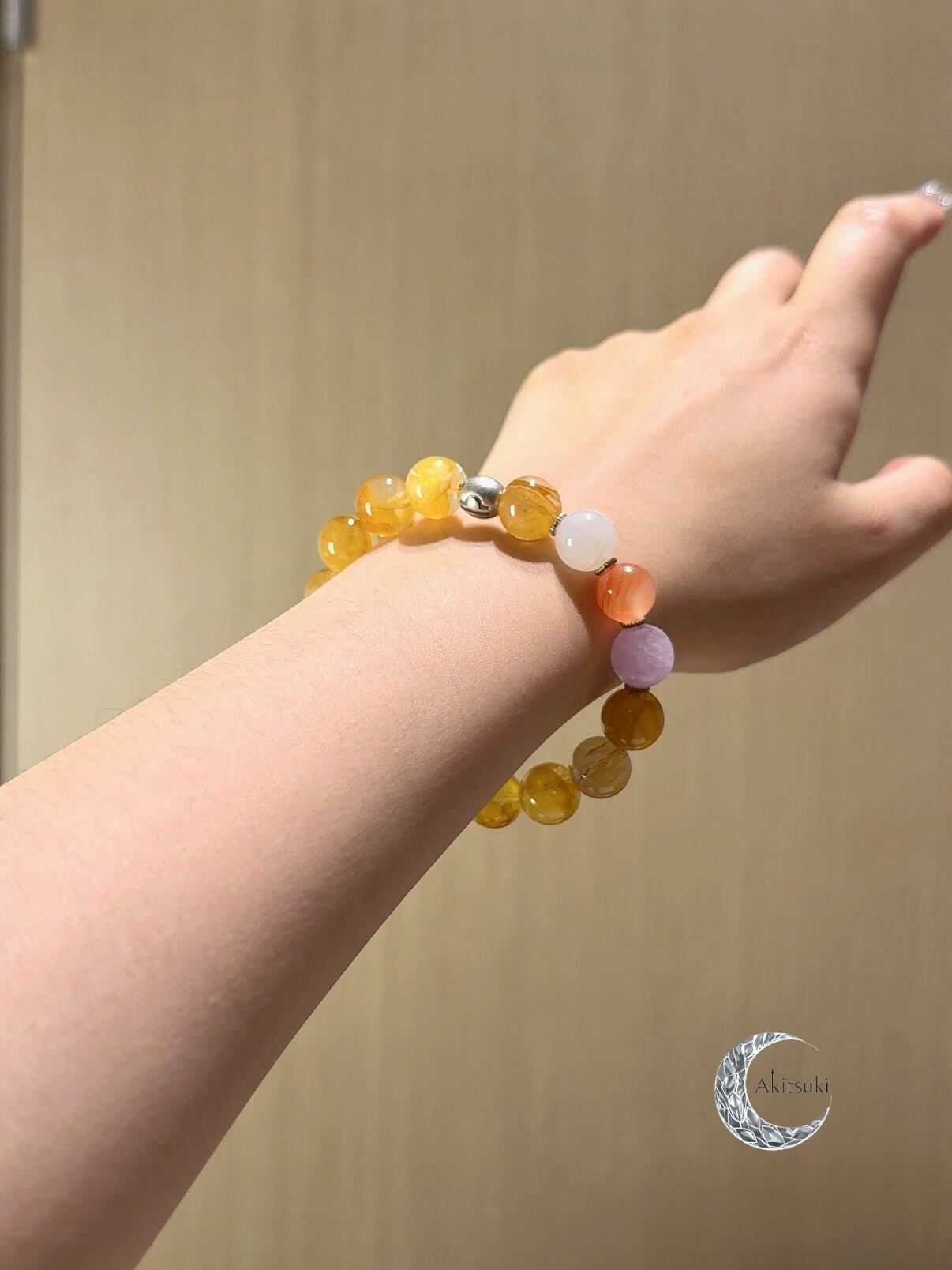 イエローコッパーフラワーの黄金色は温かく落ち着いて重厚な印象を与え、リシア輝石の柔らかくクールなトーンと組み合わさることで、てんびん座特有の「理性と感性が調和した優しい力」を生み出しています。南紅がアクセントとなって決断力と気場を演出し、ホワイトムーンストーンの加わることで全体がより生き生きと透明感を帯び、シンプルながらも決して平凡ではない配色が見れば見るほど惹きつけられます。