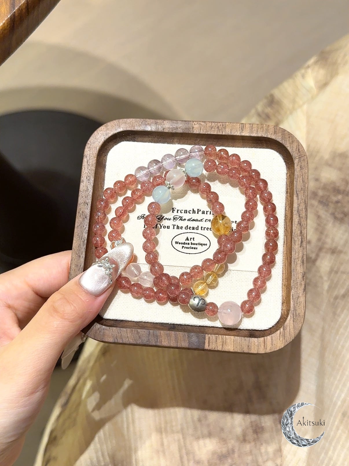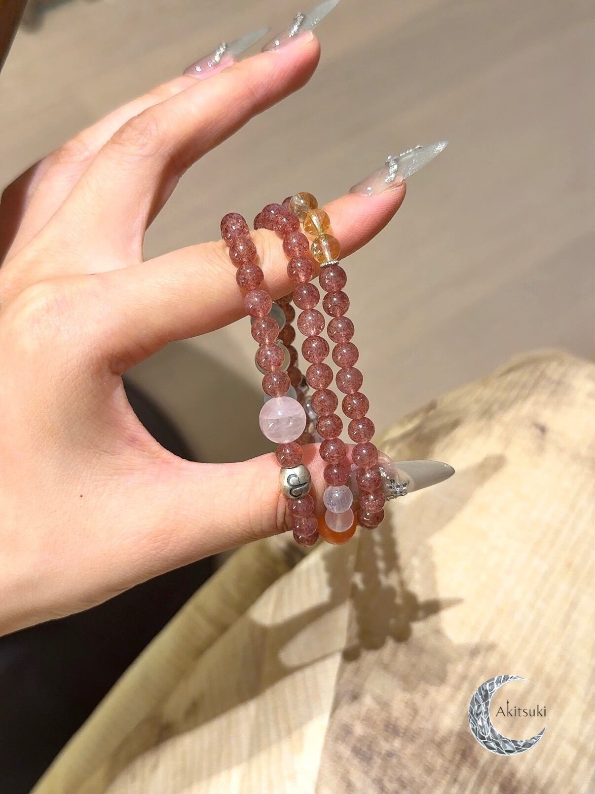 情熱を象徴する南紅瑪瑙を基調に、シトリンとストロベリークォーツが明るさと華やかさを添えています。