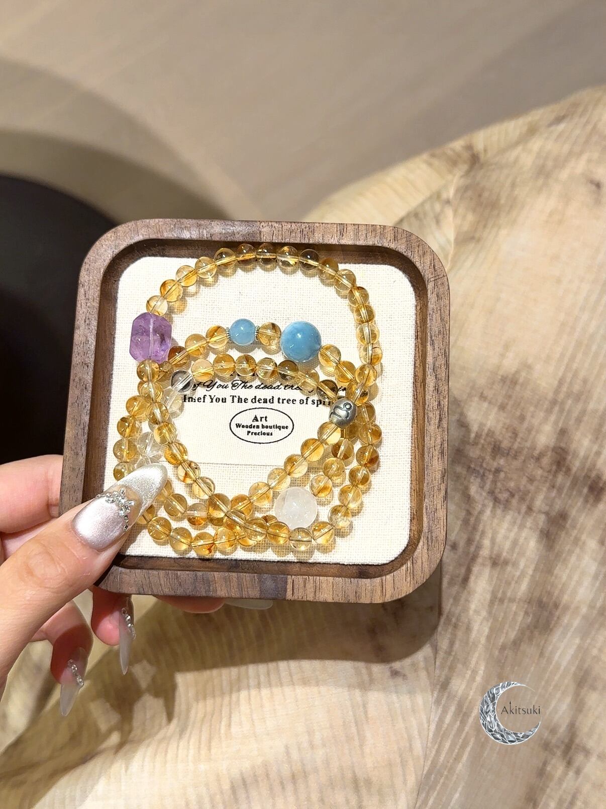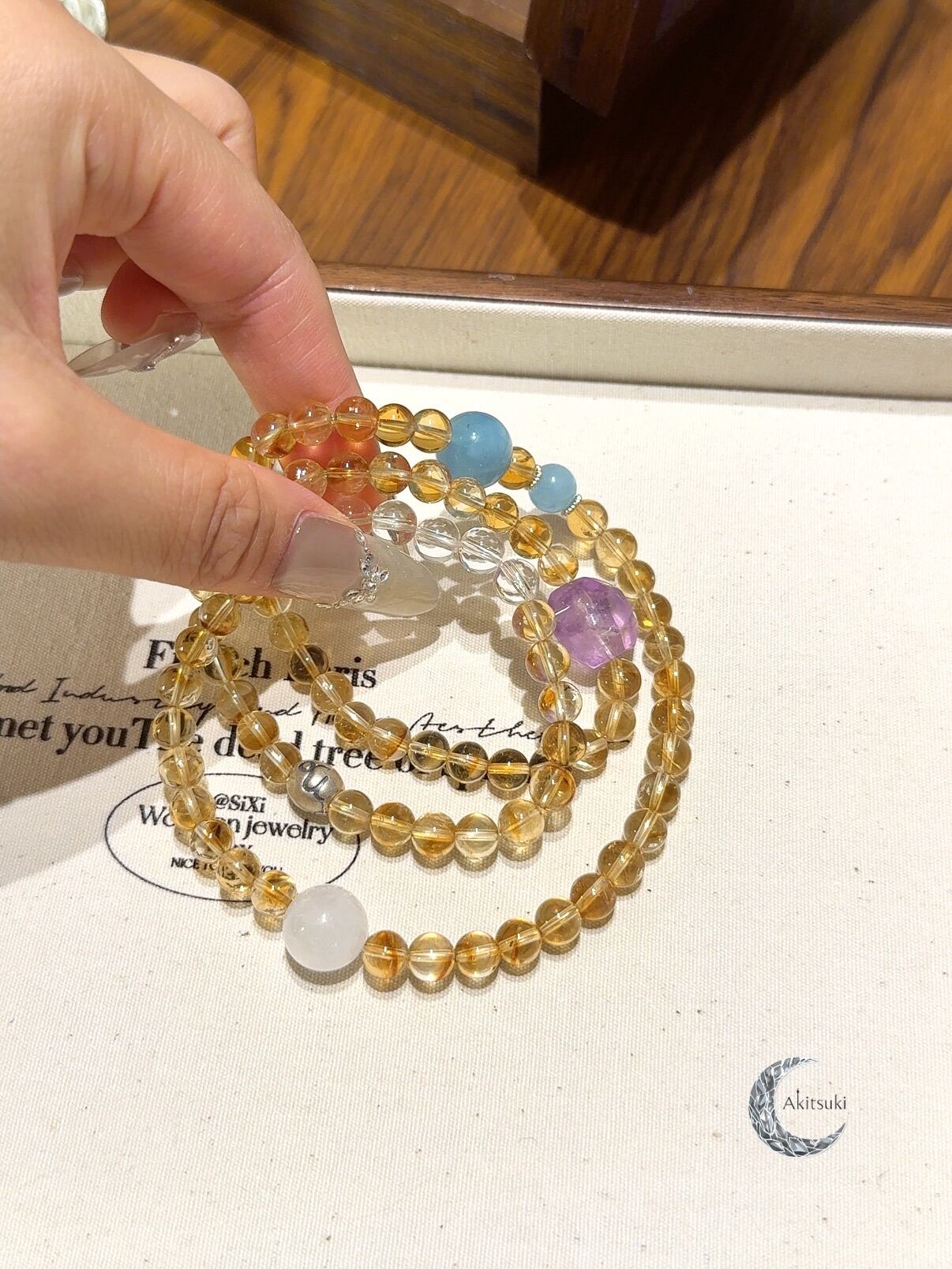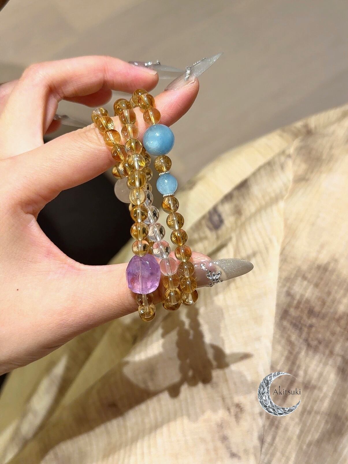 クリアクォーツとゴーストクォーツが夜空に光る星のように希望を灯し、アクアマリンとアメジストが全体に柔らかさと動きを加え、堅くなりすぎない印象を演出。
