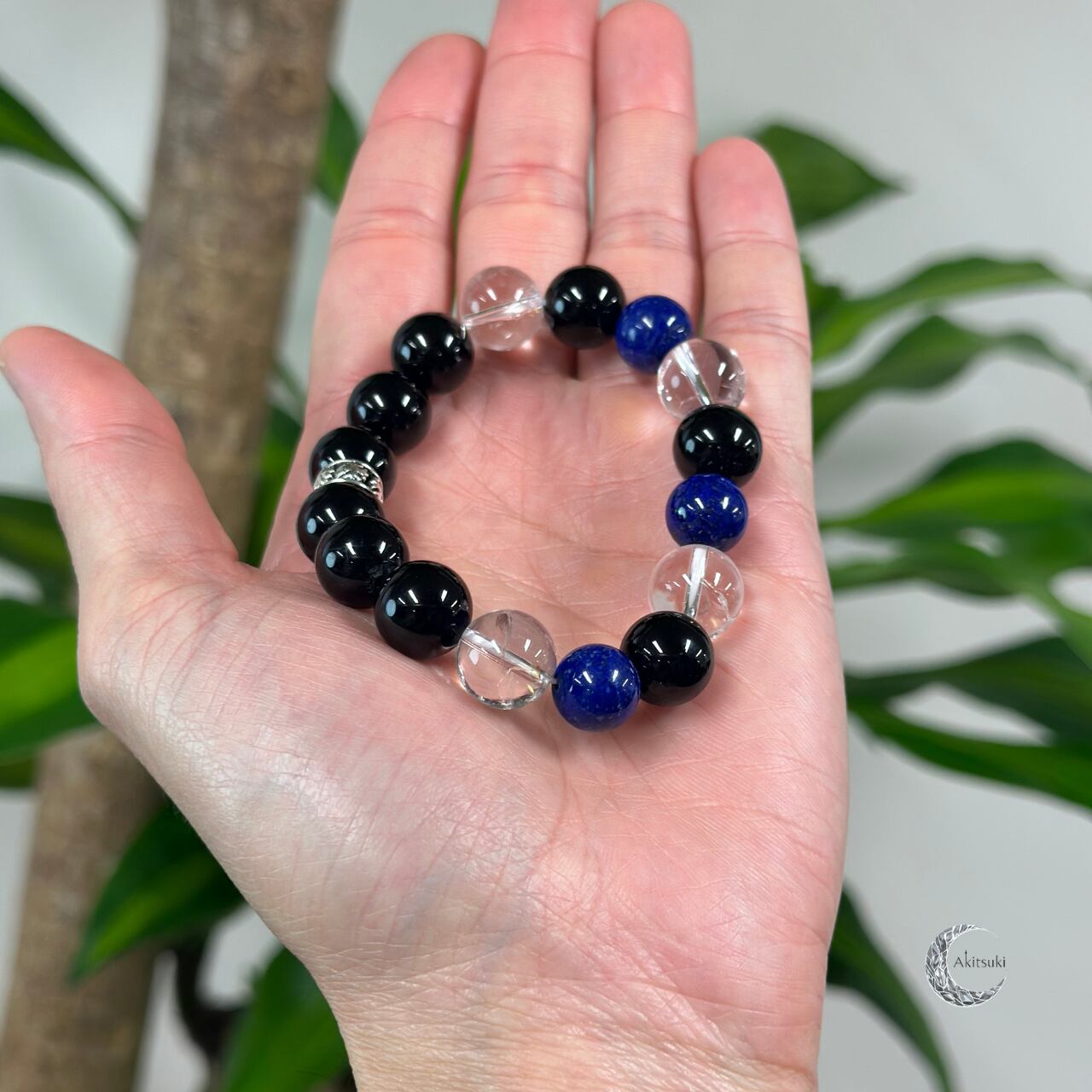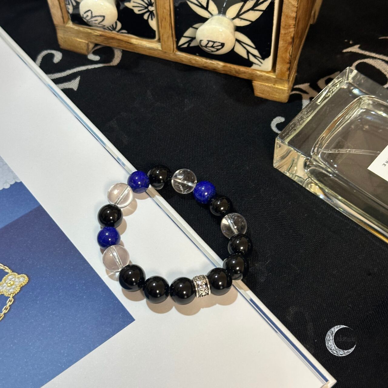 透明感あるクリアと深い青、ブラックのコントラストが手元に力強さと安定感を与え、学生時代の努力や挑戦を静かに支えてくれるブレスレットです。