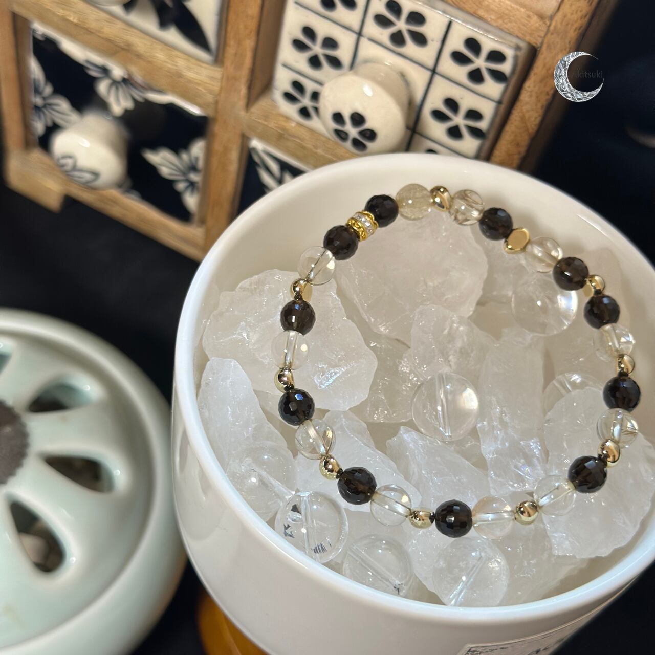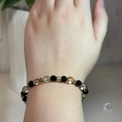 透明感あるクリアと深みのあるブラック、ゴールドのコントラストが手元に力強さと上品さを添え、挑戦や成長のステージをそっと支えてくれるブレスレットです。