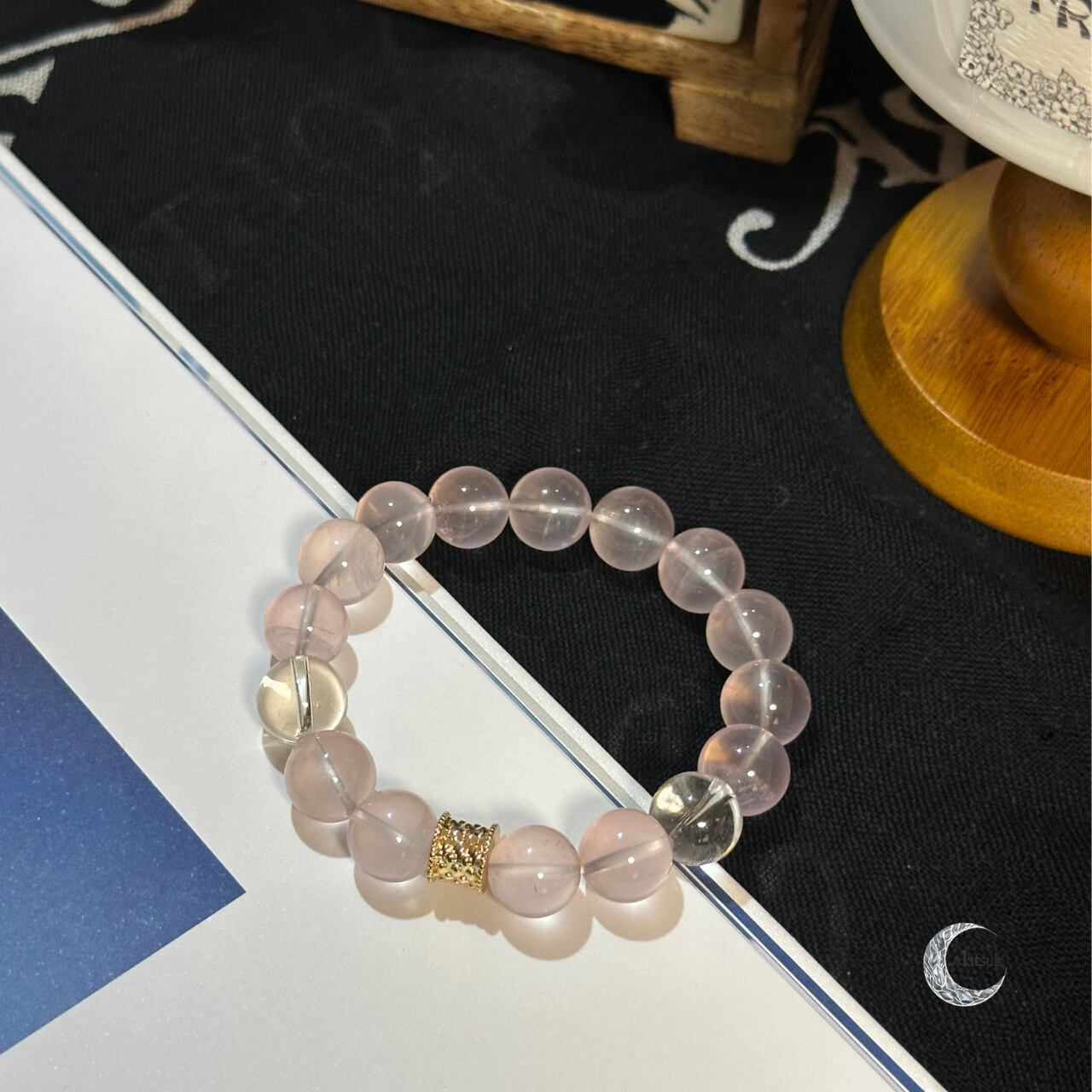 柔らかなピンクのローズクォーツと透明感ある白水晶が、手元に優しさと清らかさを添えます。