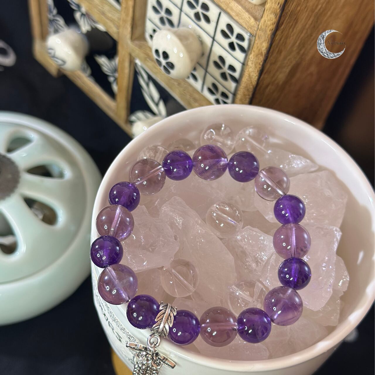 このブレスレットは、深みのある紫の光で心のざわめきを静め、