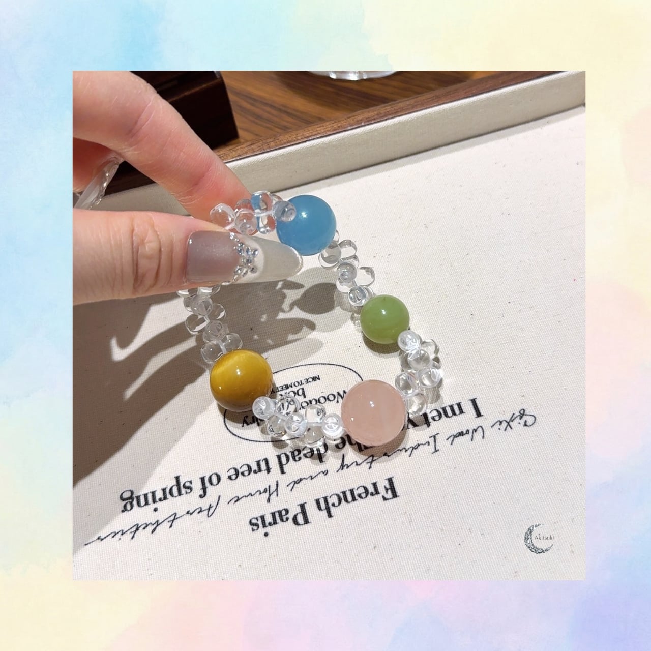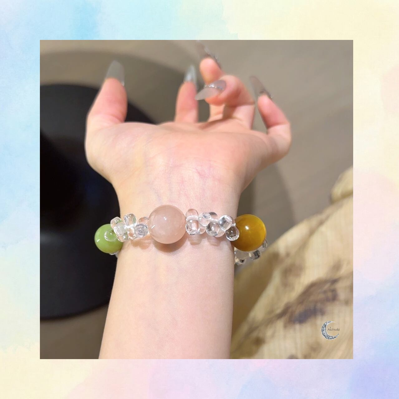 メインには透明度の非常に高い大粒クリスタルを使用し、アクアマリンの澄んだ輝き、ホワイトファントムの純粋さ、ゴールドタイガーアイの華やかさ、ローズクォーツの優美さ、そして岫玉(しゅうぎょく)の温もりを巧みに融合しました。