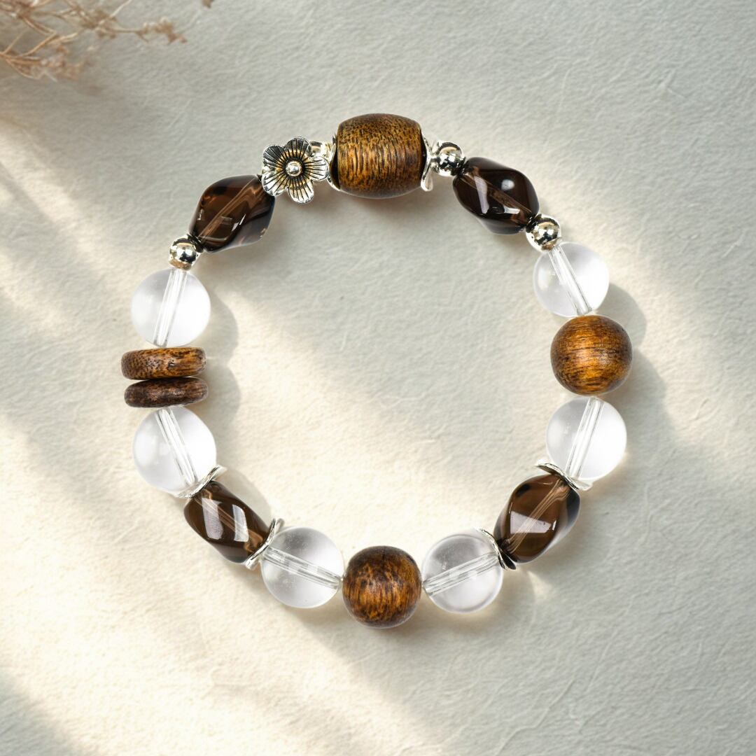 白水晶のすっきりとした透明感と、沈香のやわらかな質感が調和し、手元に静かな安らぎをもたらします。